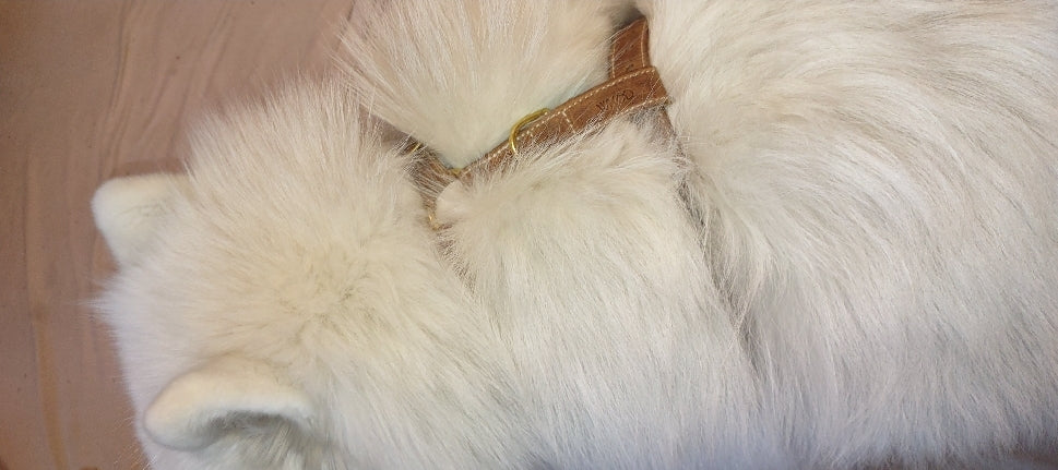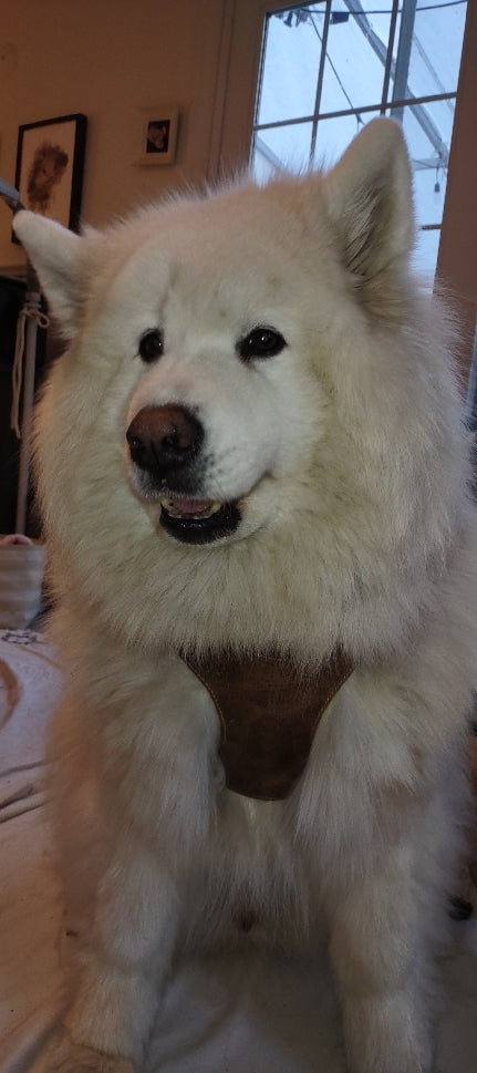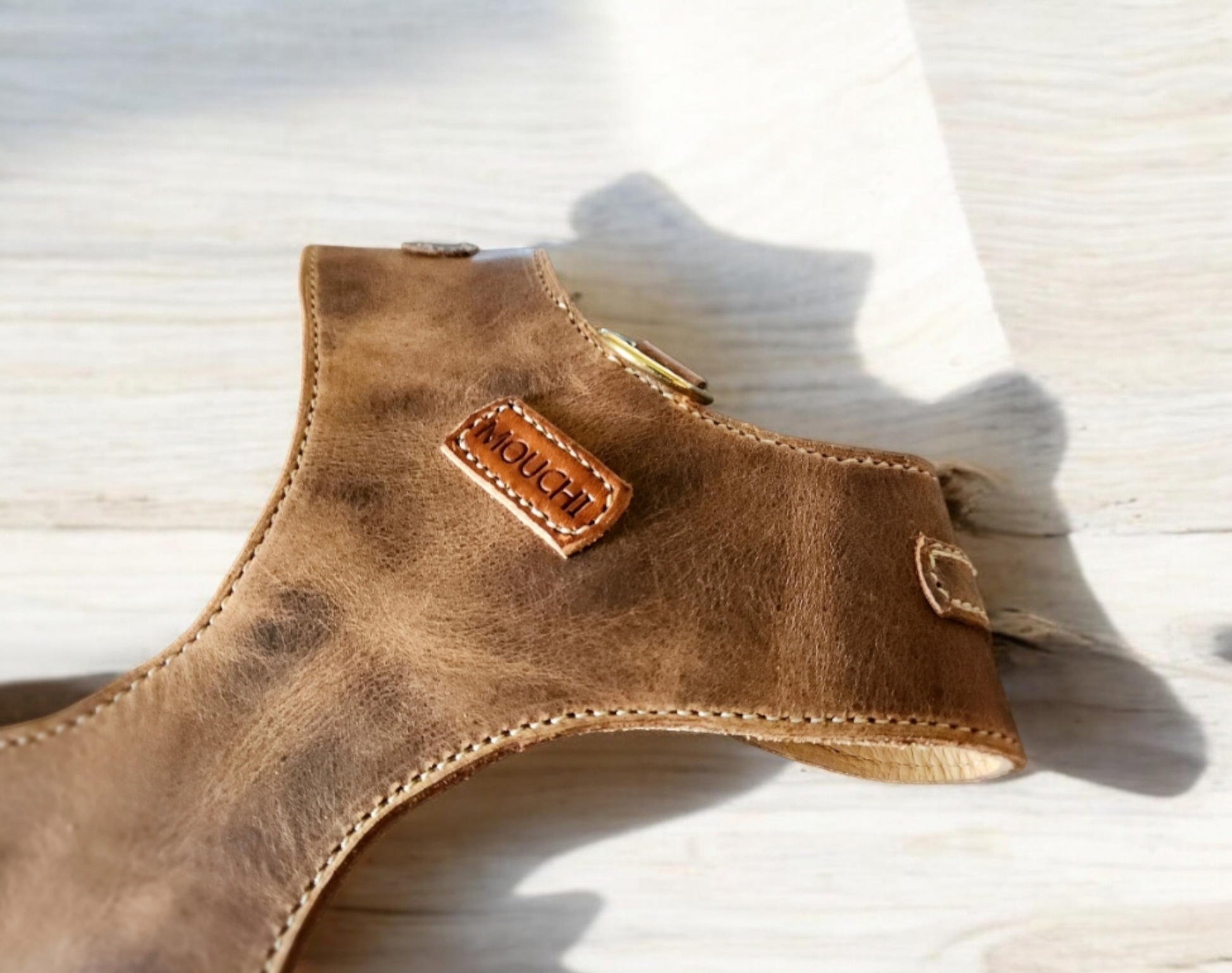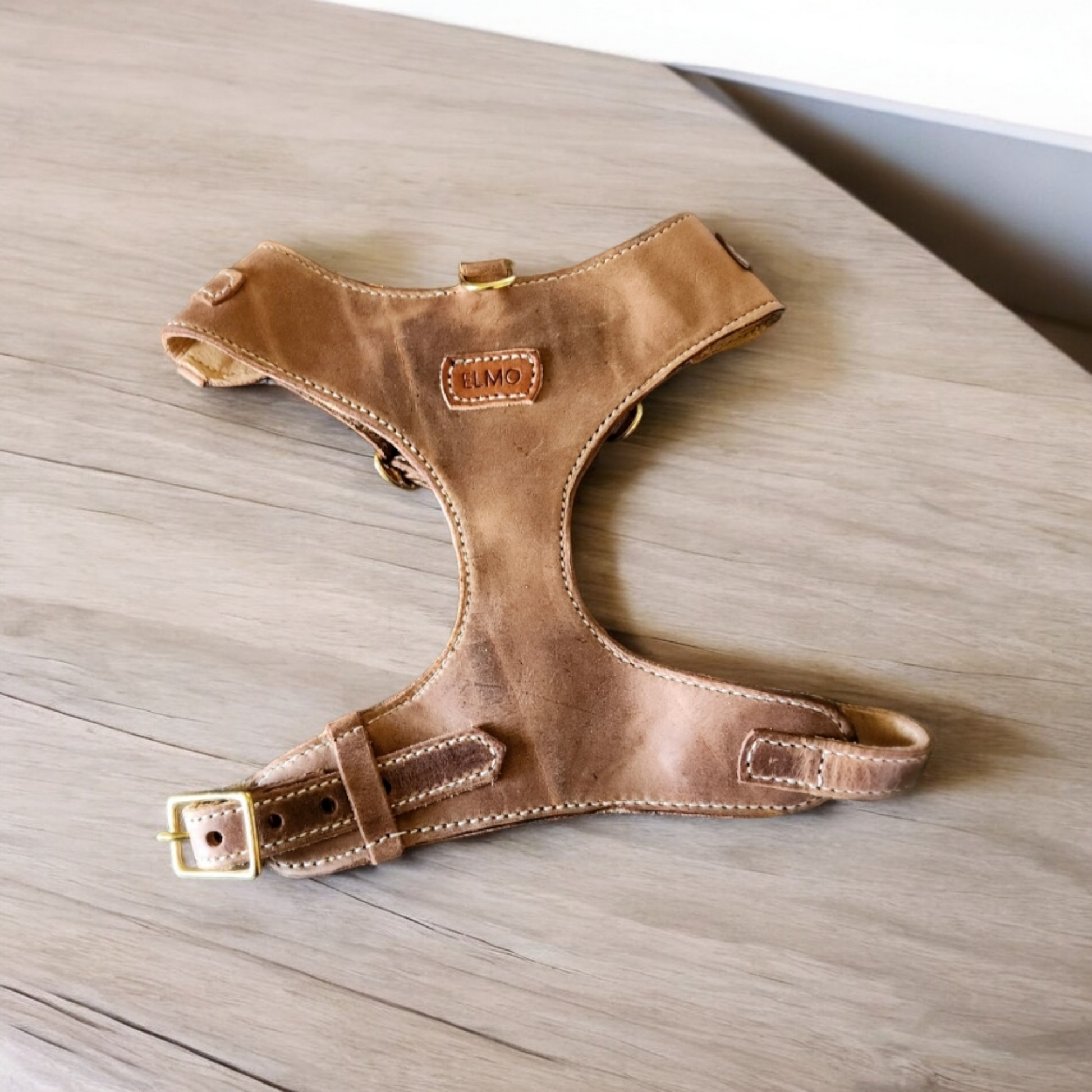 Experience the ultimate combination of style and function with the "Amelia" Whisky Australian leather dog harness. Made from 100% Australian leather and featuring solid brass hardware, this harness offers both elegance and durability. With a front attachment for no-pull control and a back attachment for easy walking, it's perfect for any dog. Its adjustable design and soft leather lining provide maximum comfort for your furry friend. Plus, the wider chest harness helps reduce friction on long hair. Upgrade to the unique and popular Amelia harness today.